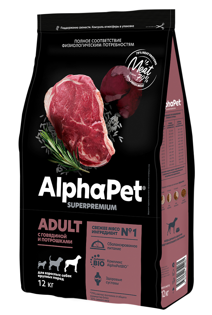 Сухой полнорационный корм с говядиной и потрошками для взрослых собак крупных пород.