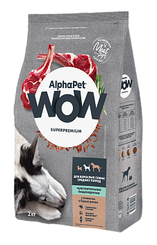 Alphapet 15кг "WOW"Сухой корм для взрослых собак средних пород с чувствительным пищеварением, ягненок и рис