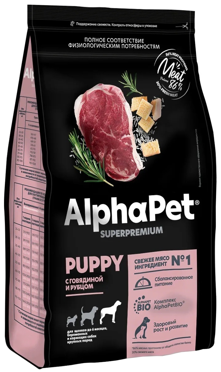 Корм AlphaPet Superpremium Puppy для щенков, беременных и кормящих собак крупных пород, c говядиной и рубцом