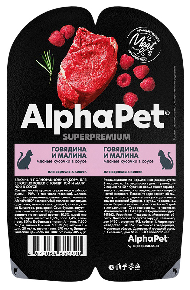 Корм AlphaPet Superpremium (в соусе) для кошек, с говядиной и малиной, 80 г