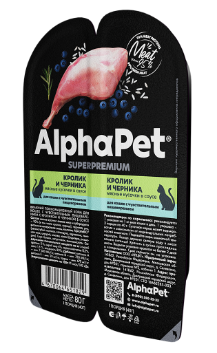 Состав: мясные кусочки: свежее мясо и субпродукты - 90% (в том числе кролик, курица), черника, рис, витаминно-минеральная смесь, комплекс AlphaPetBIO (зеленогубый моллюск, календула, одуванчик, льняное семя, цикорий, клюква, юкка Шидигера, розмарин). Соус: бульон, загустители, аминокислоты. Содержание питательных веществ на кг: сырой протеин 11%, сырой жир 4%, сырая клетчатка 0,2%, зола 1,5%, влажность 80%.