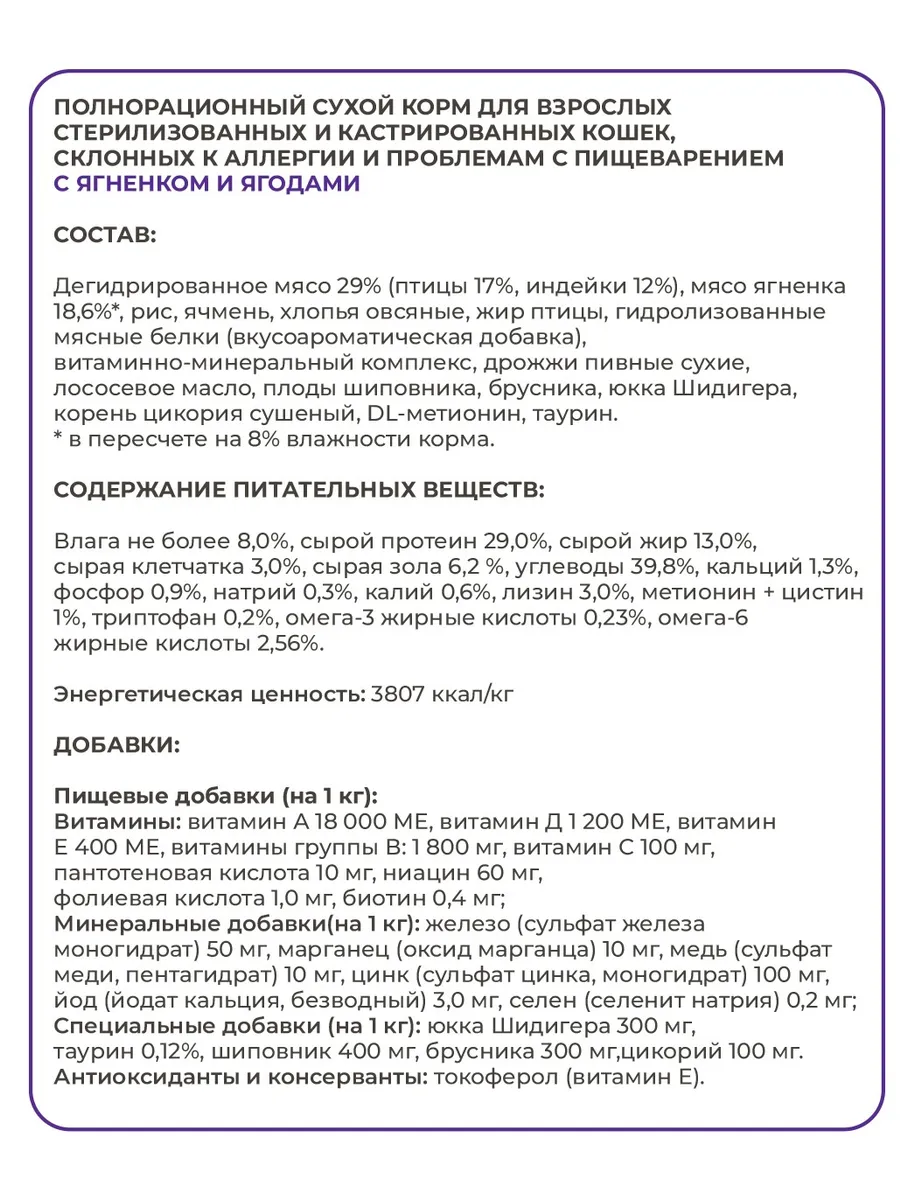 Состав: мясо ягненка 18,6%*,дегидрированное мясо 29% (птицы 17%, индейки 12%), рис, ячмень, хлопья овсяные, жир птицы, гидролизованные мясные белки (вкусоароматическая добавка), витаминно-минеральный комплекс, дрожжи пивные сухие, лососевое масло, плоды шиповника, брусника, юкка Шидигера, корень цикория сушеный, DL-метионин, таурин. * в пересчете на 8% влажности корма.