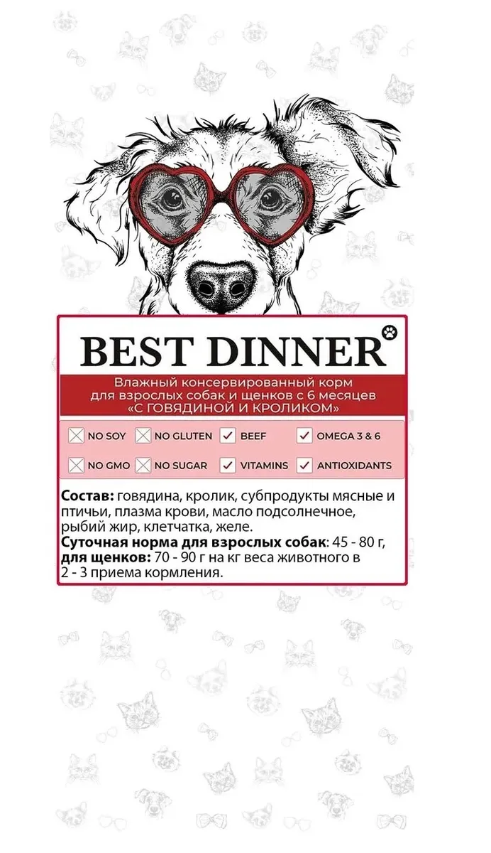 Состав: говядина, кролик, субпродукты, желирующая добавка, растительное масло, злаки, соль, вода. В 100 г содержится: сырой протеин, не менее 10,0 г; сырой жир, не более 8,0 г; сырая зола, не более 2,0 г; поваренная соль 0,3–0,7 г; влага, не более 80,0 %.