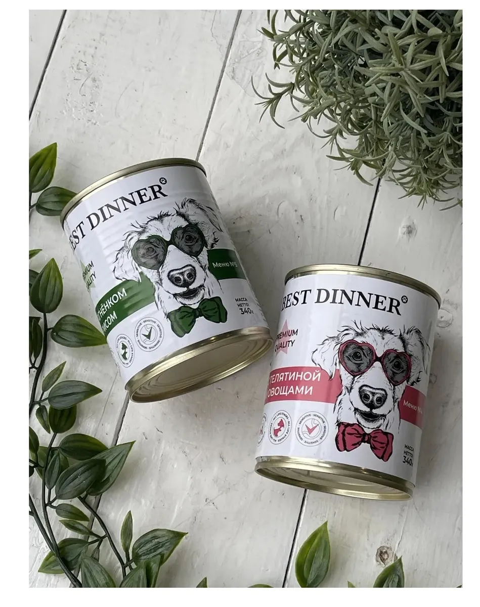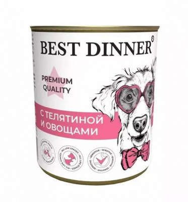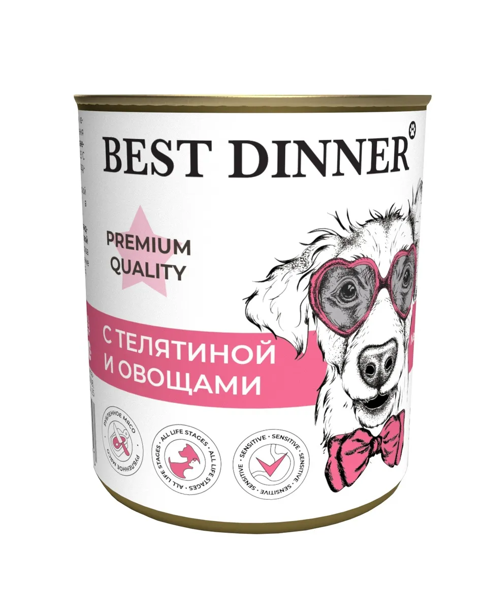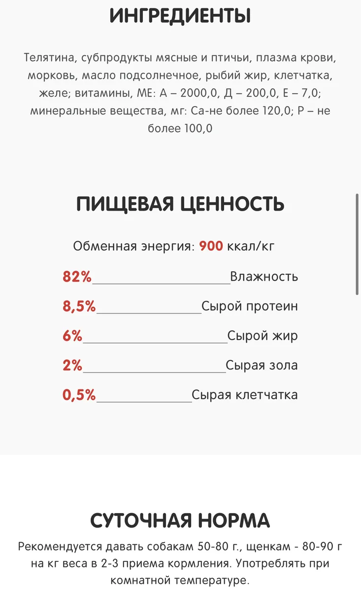 Состав: телятина, субпродукты, морковь, лук, желирующая добавка, растительное масло, злаки, соль, вода. В 100 г содержится: сырой протеин, не менее 5,5 г; сырой жир, не более 5,0 г; сырая зола, не более 2,0 г; поваренная соль 0,3–0,7 г; влага, не более 80,0 %. Минеральные вещества в 100 г продукта: общий фосфор, не более 0,7 г; кальций, не более 0,5 г.