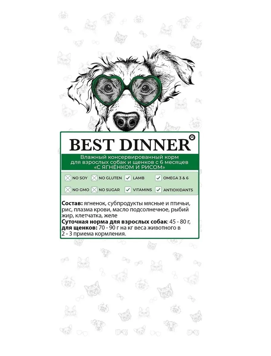 Состав: ягненок, субпродукты мясные и птичьи, рис, плазма крови, масло подсолнечное, рыбий жир, клетчатка, желе. 82% Влажность; 9% Сырой протеин; 6,5% Сырой жир; 2% Сырая зола; 0,5% Сырая клетчатка.