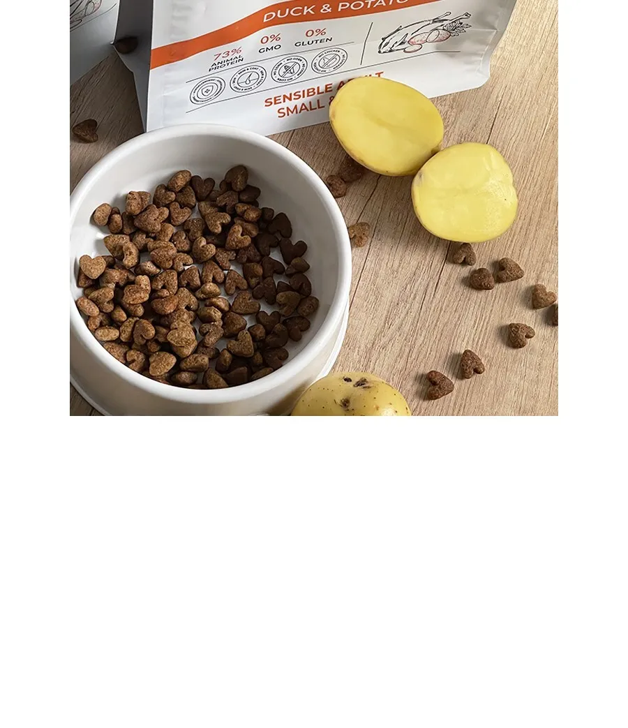 Дегидрированое мясо индейки 26%, рис, ячмень, мясо утки 8%, хлопья овсяные, картофель, жир птицы, гидролизованные мясные белки (вкусоароматическая добавка), витаминно-минеральный комплекс, дрожжи пивные, масло лосося 0,7%, глюкозамин, корень цикория сушеный, экстракт юкки Шидигера, розмарин, лютеин (экстракт бархатцев), хондроитин.
