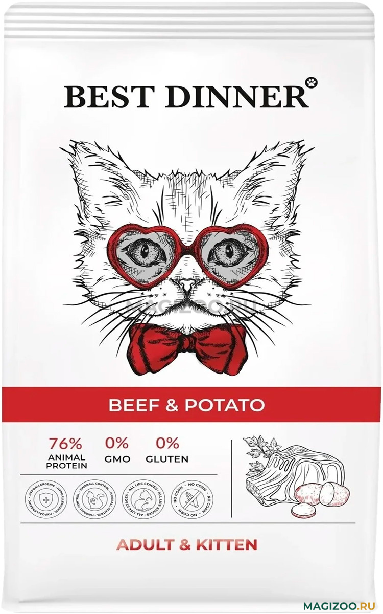 Состав: дегидрирование мясо 38 % (птицы 30 %, говядины 8 %), рис, ячмень, жир птицы, хлопья овсяные, картофель, гидролизованные мясные белки (вкусоароматическая добавка), витаминно-минеральный комплекс, дрожжи пивные сухие, масло лосося 0,8 %, юкка Шидигера, плоды шиповника, клюква сушеная, глюкозамин, корень цикория сушеный, DL-метионин, таурин, хондроитин.