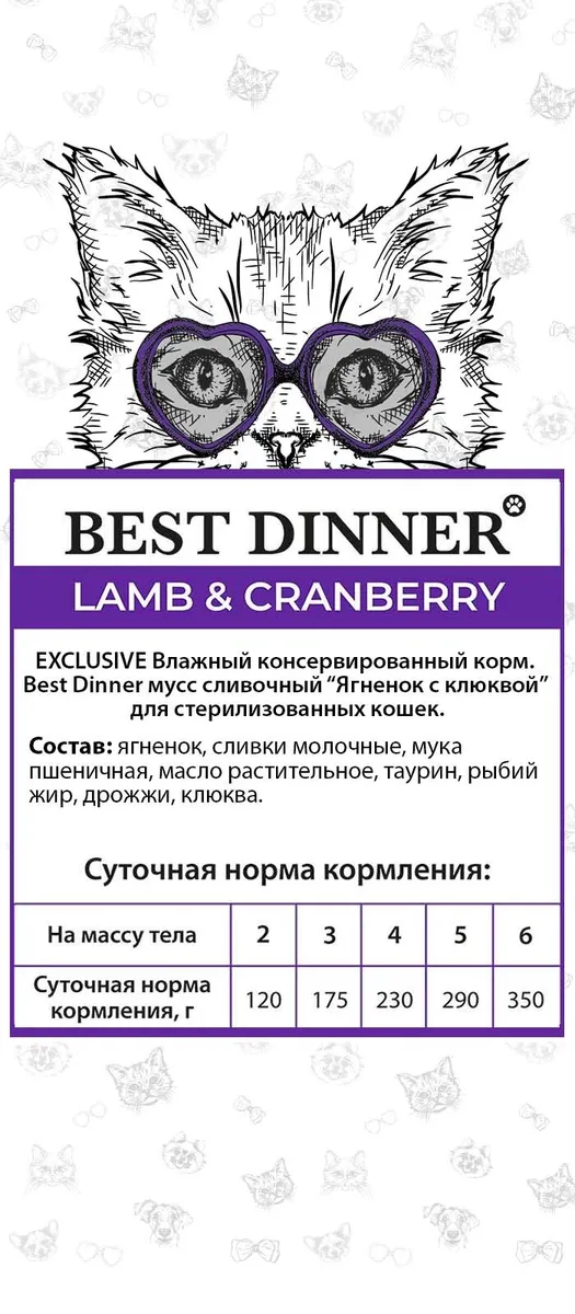 Состав: ягненок, сливки молочные, мука пшеничная, масло растительное, таурин, рыбий жир, дрожжи, клюква.