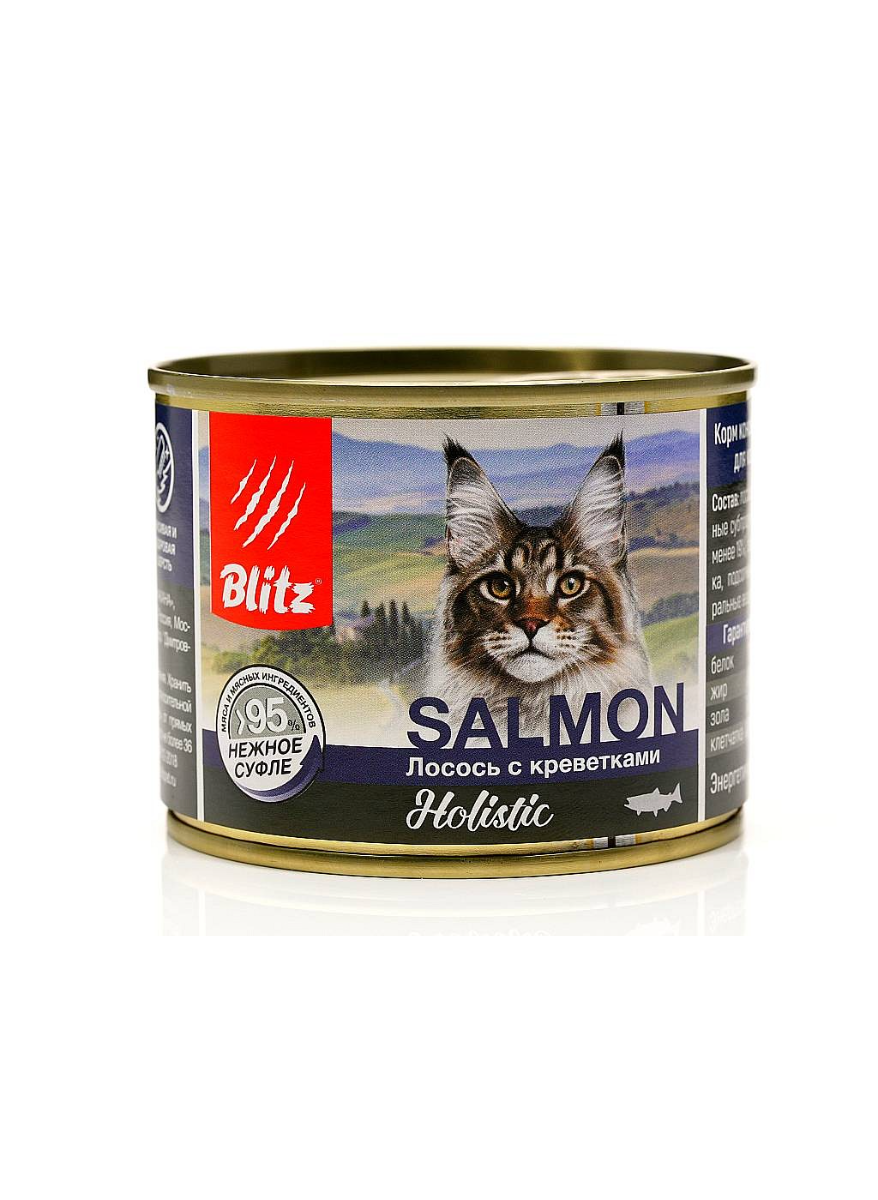 Уникальная рецептура, тщательный выбор компонентов и бережная обработка делают суфле Blitz Holistic «Лосось с креветками» отличным выбором для кошек, знающих себе цену!