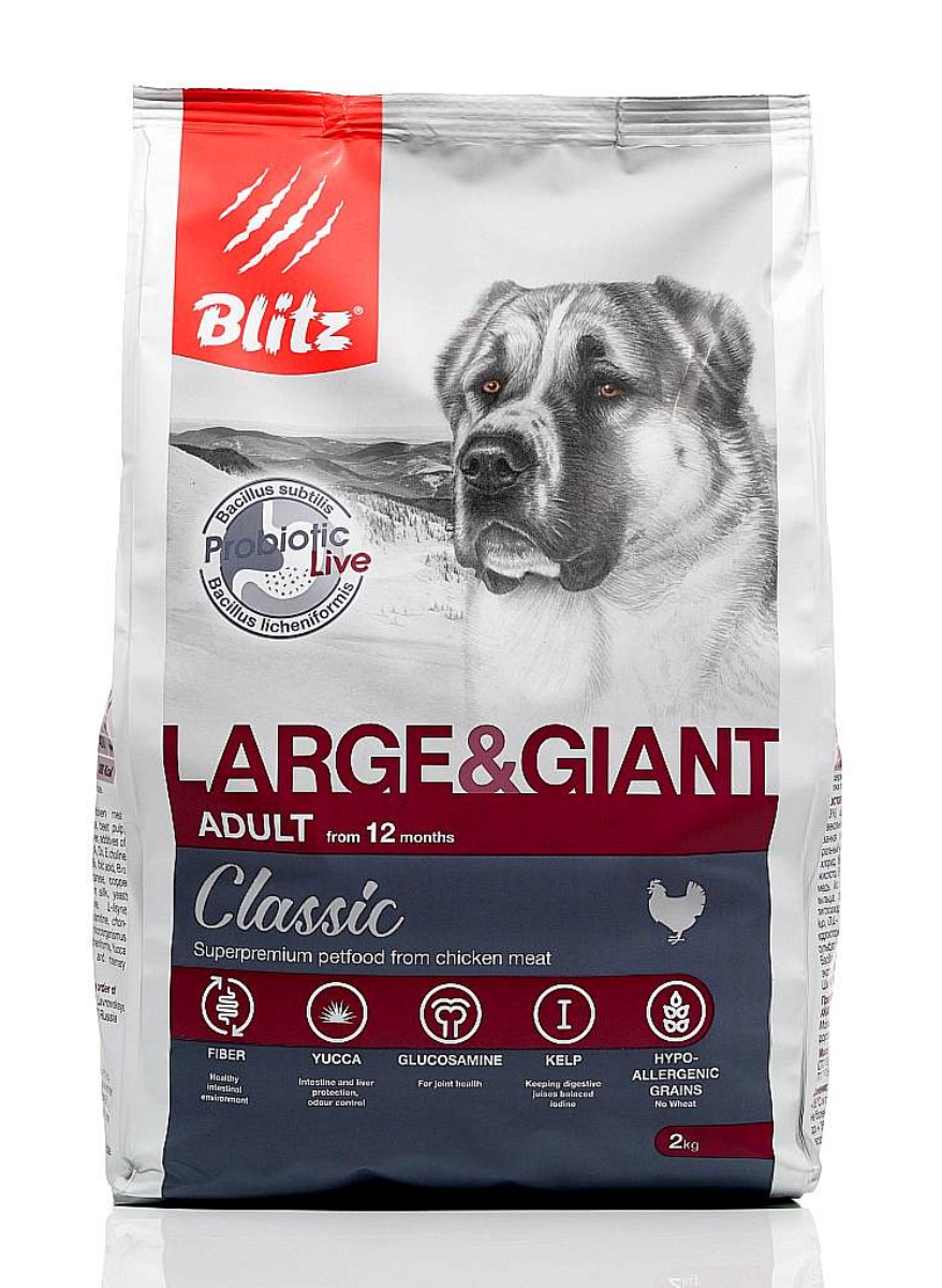 Полнорационный сухой корм Blitz Adult Large & Giant Breeds для взрослых собак крупных и гигантских пород (весом более 25 кг) предлагается питомцам старше 12 месяцев. Этот сбалансированный легкоусвояемый рацион удовлетворяет все жизненные потребности собаки и дарит ей необходимую энергию, отличный внешний вид и крепкое здоровье.