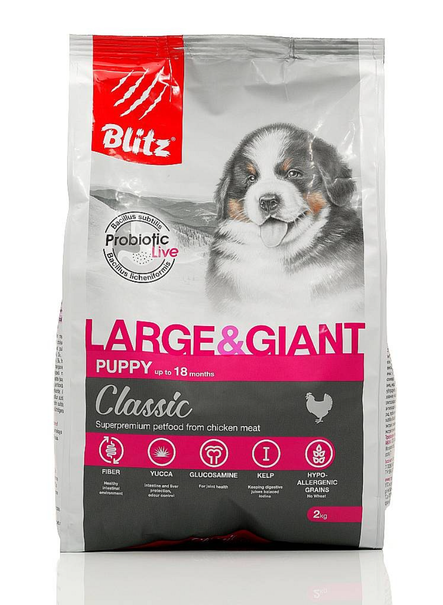 Полнорационный сухой корм суперпремиум-класса Blitz Puppy Large & Giant Breeds — лучший вариант для щенков крупных и гигантских пород собак (весом более 25 кг) в возрасте от 1,5 до 19 месяцев. Рацион обеспечивает контроль массы тела и профилактику заболеваний суставов у малышей большого размера, а также дарит им крепкое здоровье, энергию для игр и познания мира.
