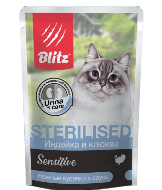 Кастрированные и стерилизованные коты и кошки нередко бывают склонны к полноте из-за падения уровня гормонов и некоторого снижения жизненной активности. Чтобы они не набирали лишний вес, им рекомендуется подбирать менее калорийный рацион. Влажный корм Blitz «Индейка и клюква» отличается сниженным содержанием жира, в него также добавлен L-карнитин, который способствует более эффективному сжиганию калорий и не даёт им откладываться в жир.