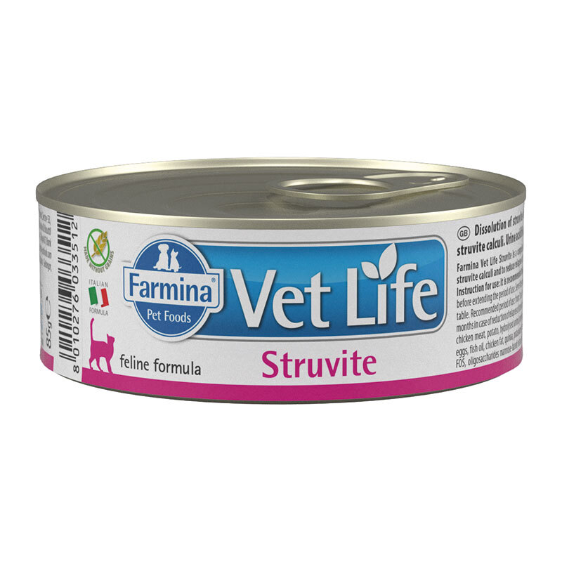Farmina Vet Life Struvite – полнорационный диетический влажный корм для кошек для лечения и профилактики рецидивов струвитного уролитиаза.