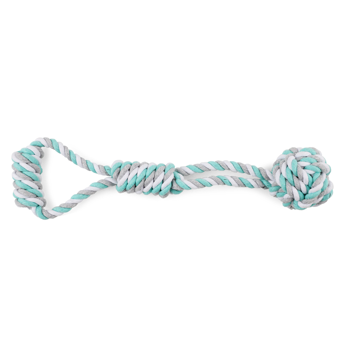 Веревочный мяч с ручкой выполнен в нежной цветовой гамме и предназначен для щенков, которые обожают взаимодействовать с такими игрушками, грызть их, трепать и носить в зубах. Игрушка способна надолго привлечь внимание питомца и стать вам верным помощником в его воспитании, дрессировке и организации досуга. Веревка сплетена из нитей натурального хлопка, поэтому безопасна для здоровья Вашего питомца. Цвет изделия: мятно-серый. Размер изделия: 260*65*45мм.