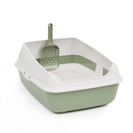 Кошачий туалет с высоким бортиком, сеткой и совком изготовлен из прочного пластика, безопасен для здоровья питомца и не имеет посторонних химических запахов.