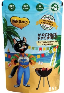 Состав: мясо и мясные субпродукты (утка 4%, индейка 4%, курица 4%), злаки, витамины и минералы.