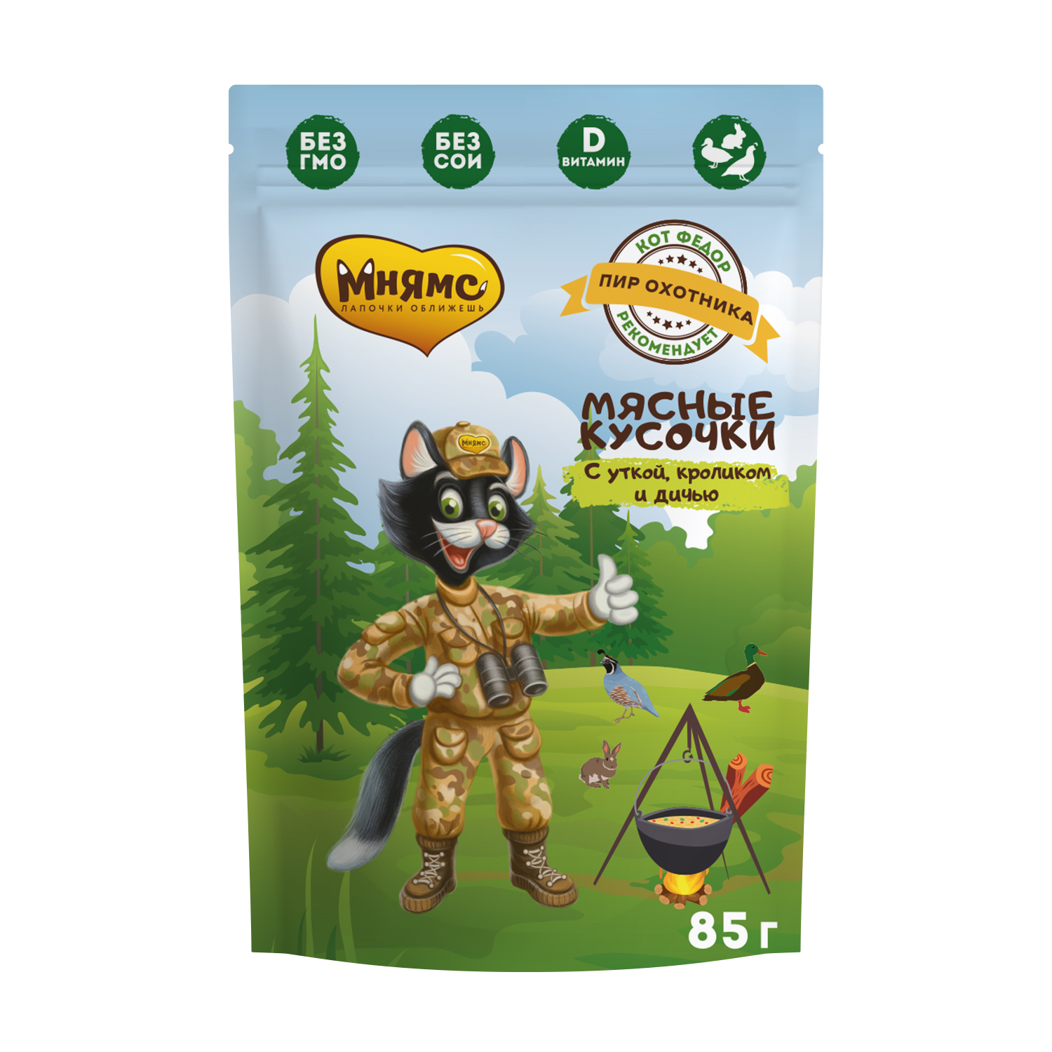 Насыщенный вкус мясных кусочков с уткой, кроликом и дичью утолит разыгравшийся аппетит настоящего охотника и придаст сил для новых приключений.