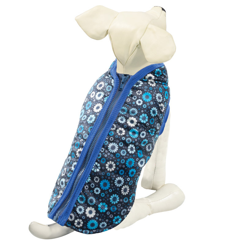 Утепленная попона "Цветик-семицветик" с флисовой подкладкой и воротничком для комфортных прогулок даже в самую ненастную погоду. Попона украшена оригинальным принтом. Застегивается при помощи молнии на спине. Длина спины: 350мм; обхват груди: 460мм; обхват шеи: 350мм. Цвет: темно-синий.