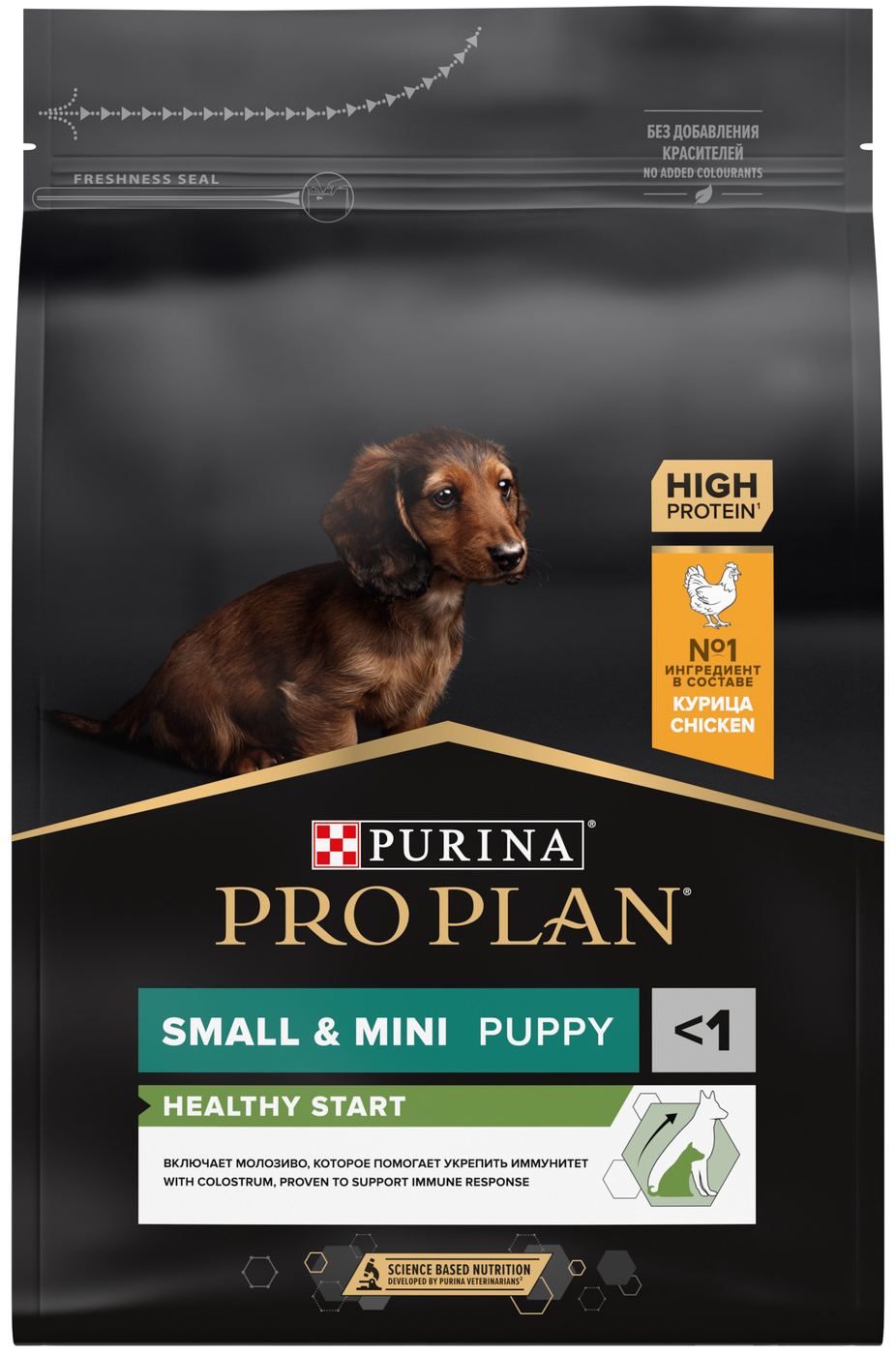 Состав: курица (18%), пшеница, сухой белок птицы, кукуруза, глютен, животный жир, кукуруза, рис (4%), вкусоароматическая комовая добавка, сухая мякоть свеклы, продукты переработки растительного сырья, минеральные вещества, рыбий жир, витамины, молозиво (0,1%). Добавленные вещества: МЕ/кг: витамин A: 25 000; витамин D3: 810; витамин E: 300; мг/кг: витамин C: 120; железо: 72; йод: 1,8; медь: 11; марганец: 34; цинк: 136; селен: 0,11. Гарантируемые показатели: белок: 32,0%; жир: 21,0%; сырая зола: 7,5%; сырая клетчатка: 2,0%.