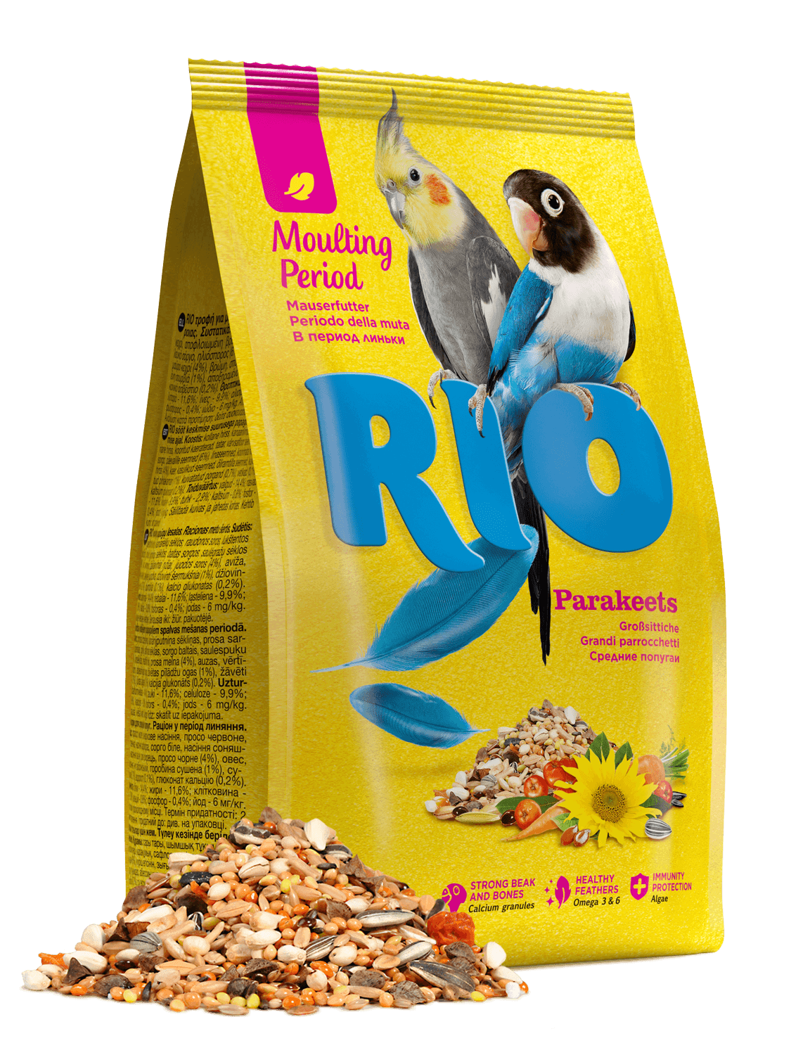Состав: просо желтое, просо красное, просо черное, канареечное семя, овсянка, гречиха, сафлор, сорго белое, семена подсолнечника, овес, семя льна, конопляное семя, нуг абиссинский, рис падди, сушеная рябина, сушеная морковь, водоросли, глюконат кальция.
